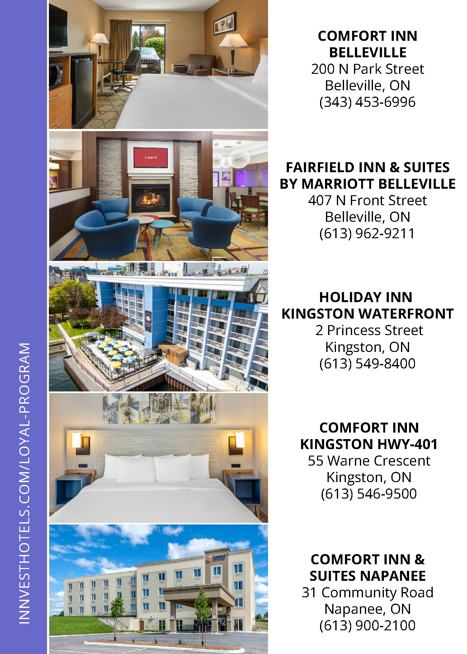 We are off Macdonald-Cartier Freeway, Highway 401, less than five kilometers from Loyalist College and Quinte Mall. The Canadian Forces Base Trenton is only 15 kilometers away. Take time to visit the well-preserved Riverside and West Zwick’s Island parks as well as Potter’s Creek Loop Trail. Our hotel provides 1,590 sq. ft. of flexible meeting space.